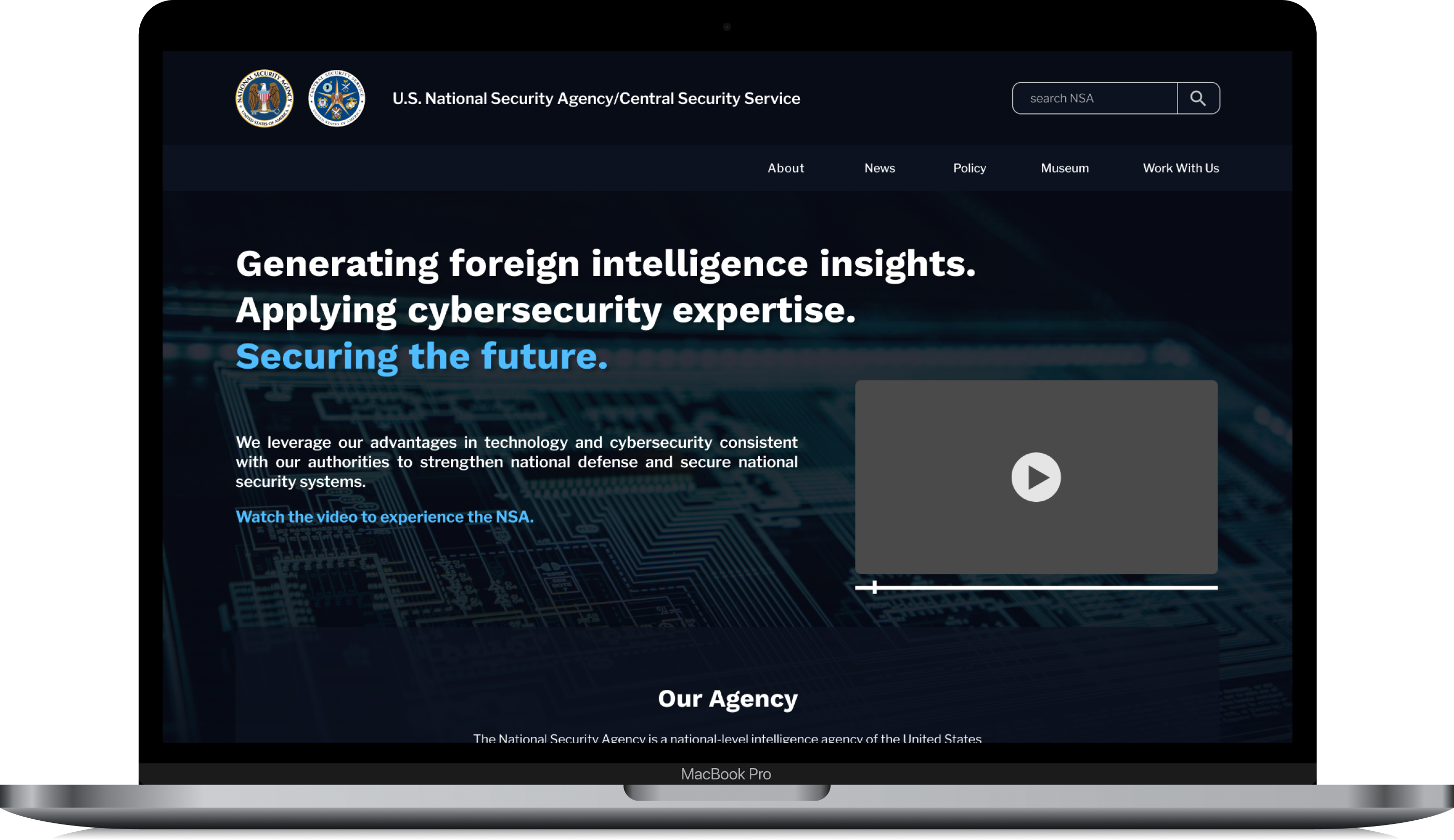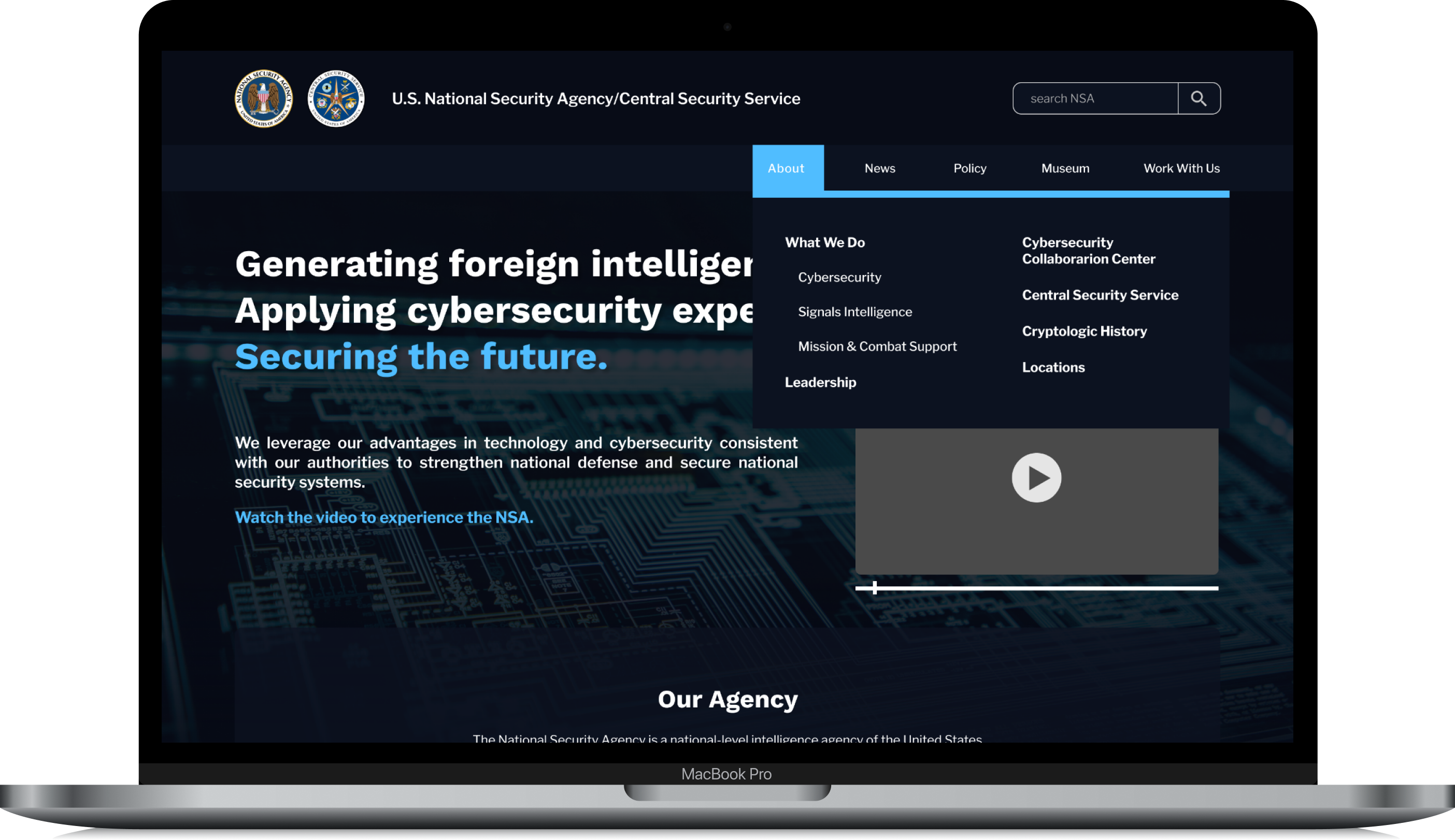 The NSA’s website should emphasize it’s role in national defense and security, and it’s role in protecting the American people. The Agency’s website should be reflective of a high-tech government website, incorporating transparency and ease of use for any reader.